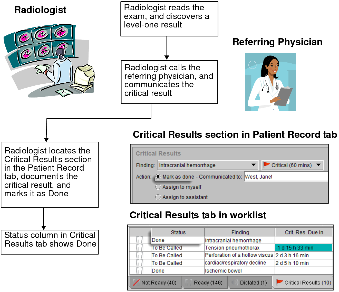 In this workflow, the radiologist calls the referring physician and communicates the critical result.