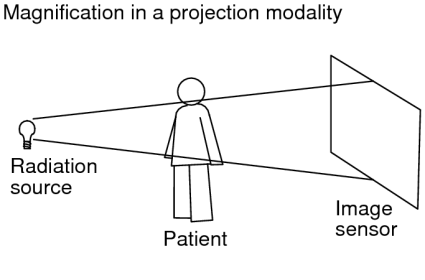 Projection radiographic images that are captured at the scanner are magnified because of the distances between the source of radiation, the patient, and the scanner’s image sensor. The greater these distances, the greater the magnification factor. The diagram below illustrates this magnification effect.