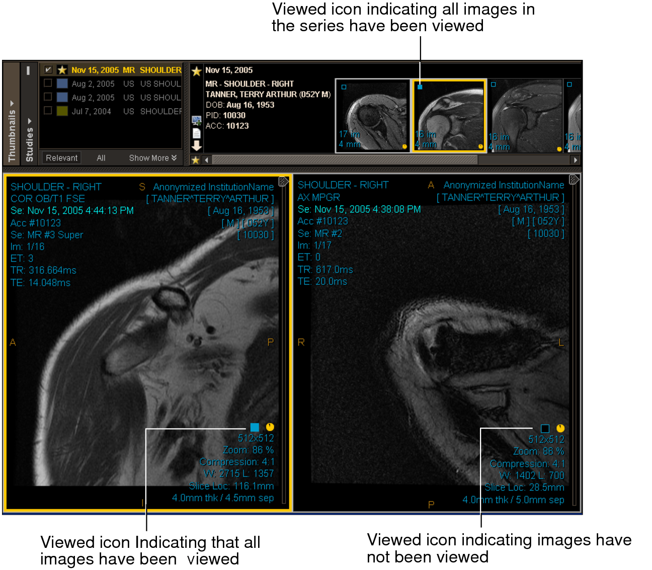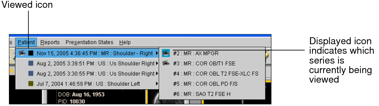 The Viewed icon also appears next to the series in the Patient menu. The Displayed icon Displayed icon indicates the studies or series currently being viewed. The blue Displayed icon Displayed icon indicates the studies or series that have been completely viewed.