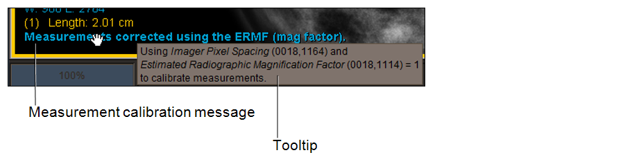 When you take a measurement, a message appears at the end of the list of measurements in the viewport to help you to determine the relevant accuracy of your measurements. You can hover your mouse cursor over the message to display a tooltip that describes the DICOM attributes that are used by InteleViewer to determine measurement calibration.