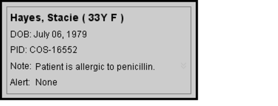 Patient notes might include information about allergies to medicines or requirements for a translator. Only the most recent patient note and the most recent patient alert are displayed. Patient notes are created using InteleConnect EV. For more information on creating patient notes, refer to the InteleConnect User Guide.