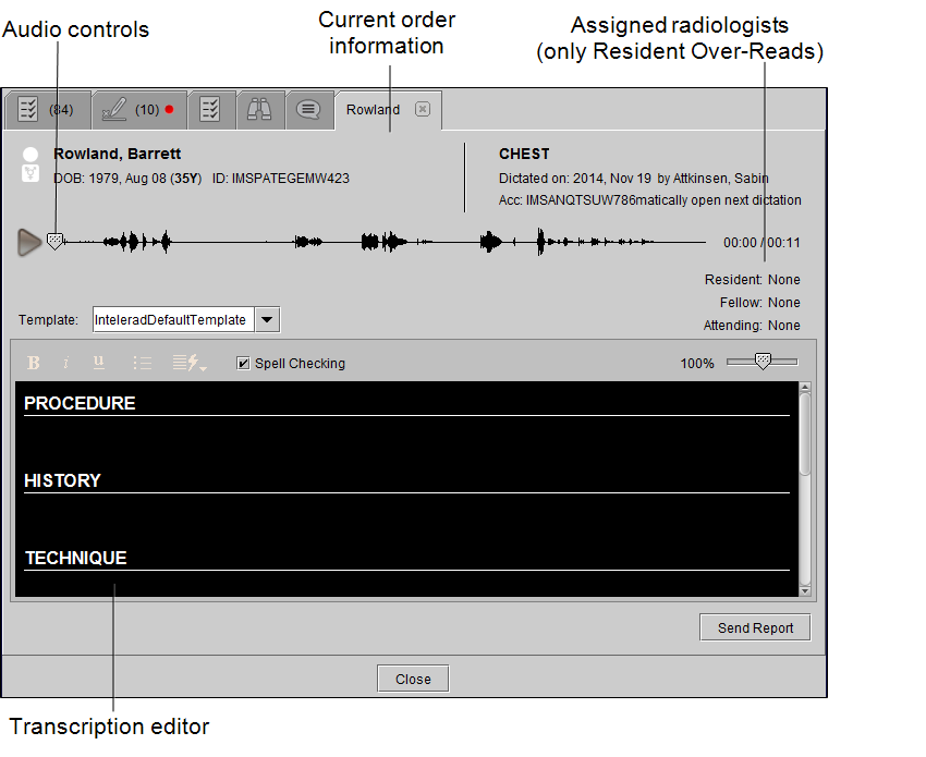 If you use Resident Over-Reads in your workflow, the transcription tab also displays the assigned resident, fellow, and attending radiologists.