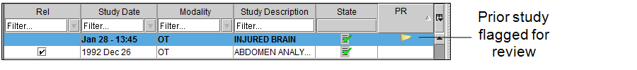 InteleViewer marks relevant prior studies for peer review with a yellow flag icon in the peer review column in the Patient Record tab.