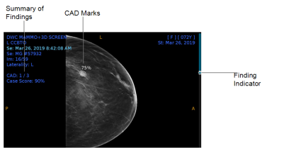 In the following example, which is from the iCAD ProFound AI,one out of the three CAD marks for the exam appears in this image. The Case Score indicates the ProFound AI's confidence, represented as a percentage, that the overall findings identified are malignant. Each CAD mark is circled on the image, with that same percentage of confidence of malignancy, indicated on the mark for that specific finding. If there are multiple findings in the series, each finding will have a finding indicator mark on the scrolling panel on the right side of the image. Not all AI systems will have these exact CAD marks or indicators, so please refer to your AI-specific product documentation for specific details.