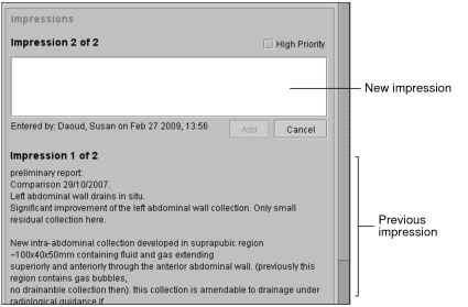 To use this feature, ask your PACS administrator to enable the Add Impressions privilege in your user account.