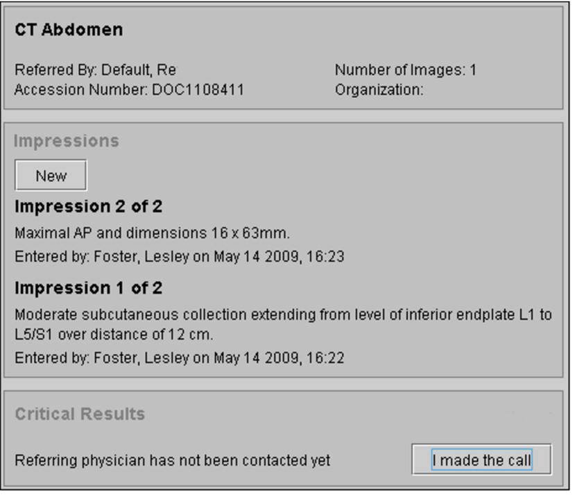 The New button is disabled if you are restricted from creating impressions for locked or dictated orders. For information, contact your PACS administrator.