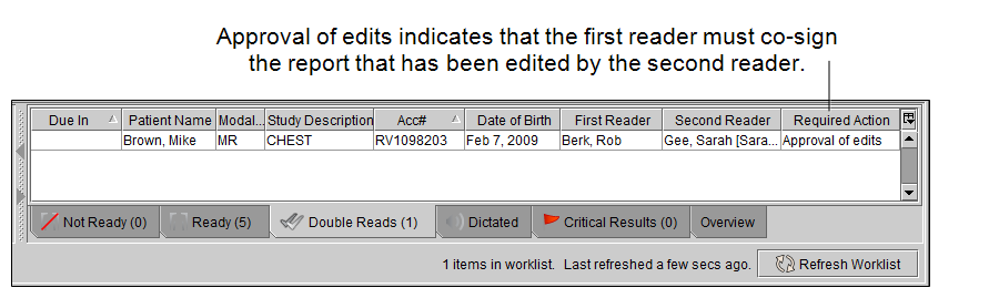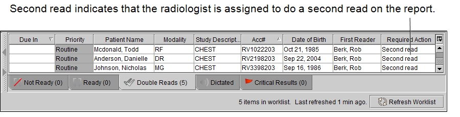 The Double Reads worklist provides access to reports to review. When you select a report from the Double Reads tab, the Double Reading form is displayed in the Patient Record tab.