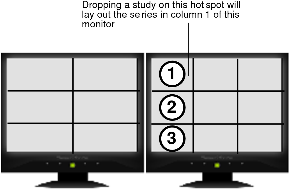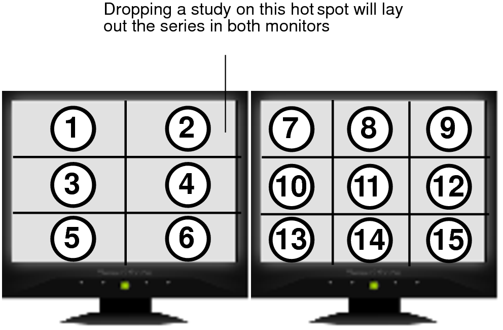 In the case of a study, as you drag the study onto a hotspot in the viewing area or Target Viewport window, the viewports are highlighted with a numbered circle to indicate the order in which the series will be dropped into the viewports.
