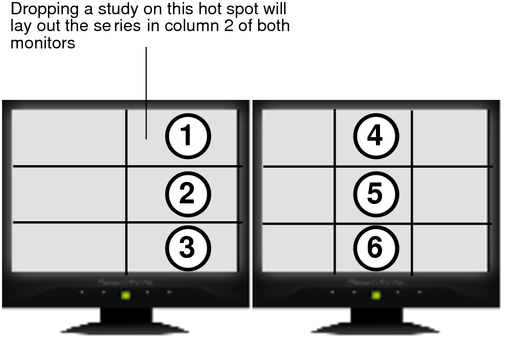 Here are several examples of using a dual-monitor setup to drag the same study from the Thumbnail strip and drop it into different hotspot areas in multiple viewports. As you drag the study, a numbered circle appears in the highlighted viewports to indicate the order in which the series will be dropped into the viewports according to the selected hotspot area.