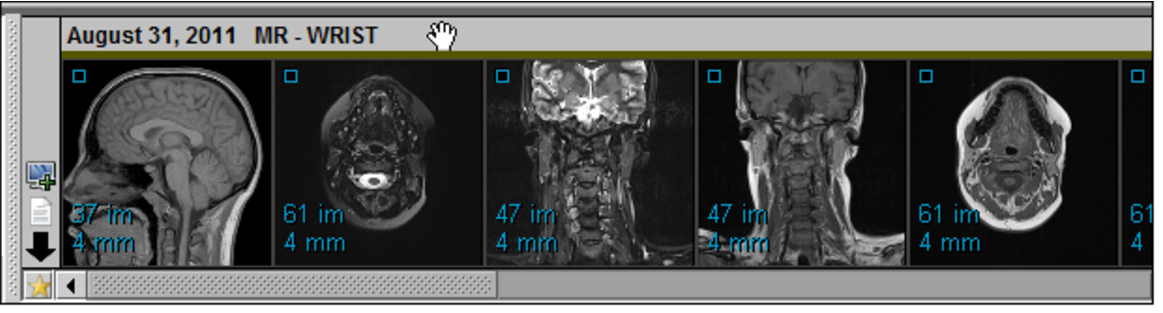 - To drag a study from the Thumbnail strip, hover your mouse cursor along the top or left side of the study panel to display a hand cursor, and then click and drag the thumbnail images onto a hotspot area in the new viewports.