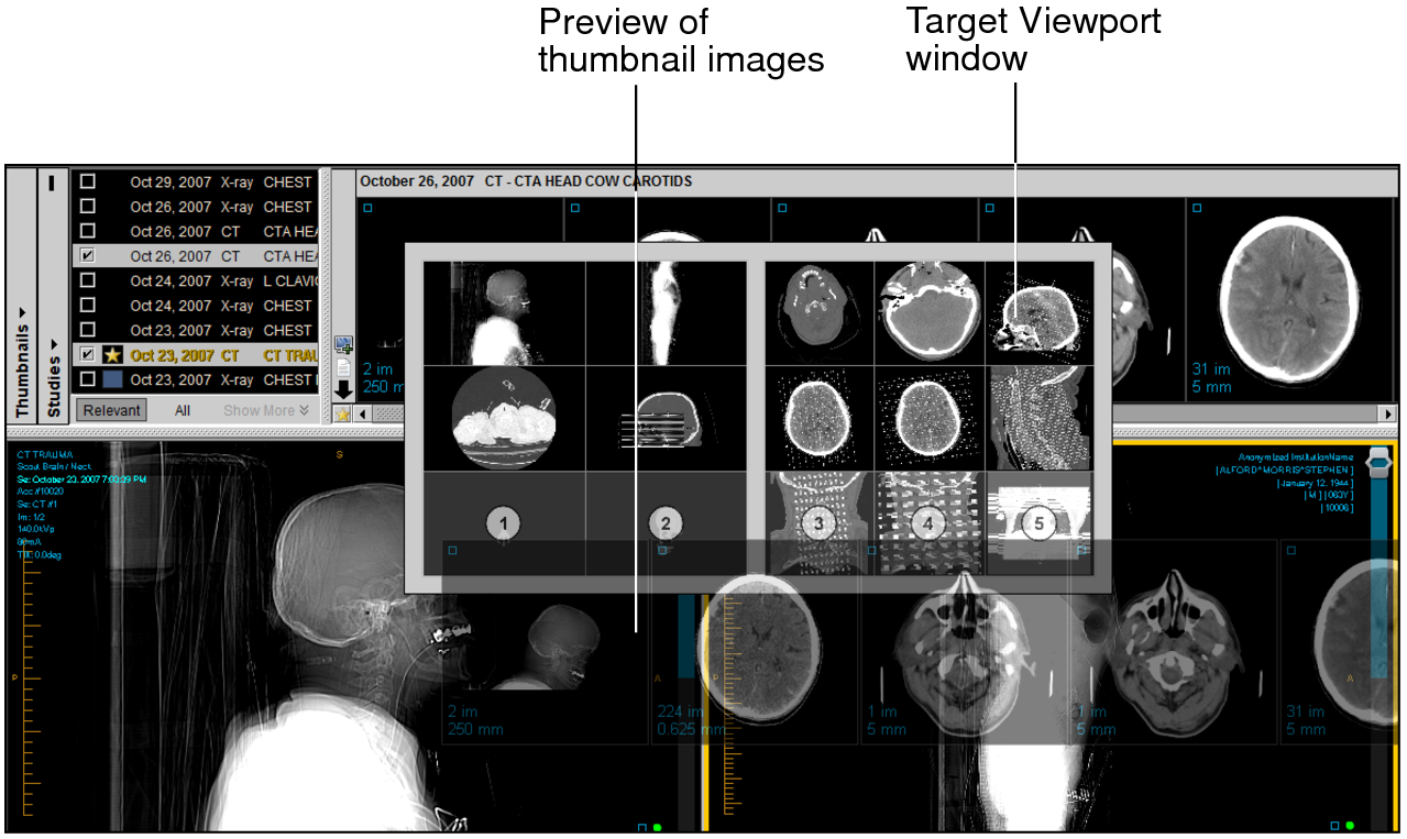 - To drag a series from the Thumbnail strip, click the thumbnail image and drag it into the new viewport.