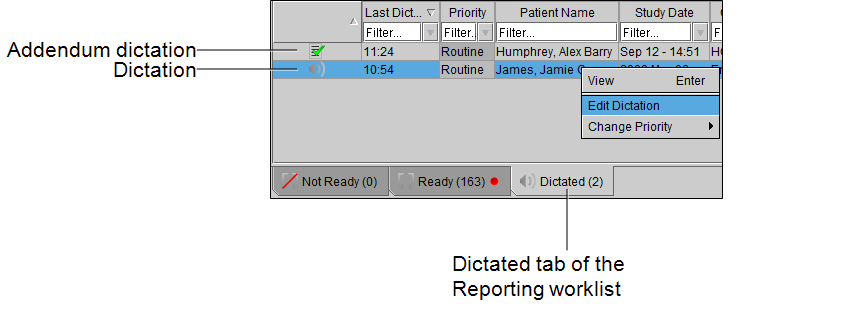 From the Dictated tab of the worklist, right-click the dictation or addendum dictation.