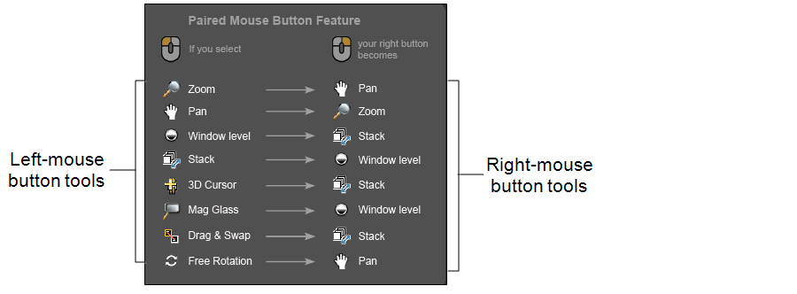 InteleViewer assigns the left- and right-mouse buttons to the following manipulation tools: