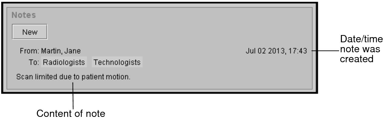 You might notice that the From field does not display the name of the user that created the note. If the note originates from a RIS, the display name configured for that RIS is displayed instead of the note author. This name is configured during the integration setup. It is recommended as a best practice that the name of the author be included in the note text when the note is sent from a RIS. For more information, contact the Intelerad Technical SupportCenter.