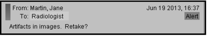 While messages communicated in the Impressions section are used for diagnostic purposes, messages in the Notes section can be used to convey information about images associated with the order. For example, perhaps artifacts are visible in the images, and the technologist leaves a note to the radiologist to explain the cause for such—the patient was not able to receive sedation, for example—and to inquire whether new images are necessary. The radiologist can respond to the technologist’s inquiry using the Notes feature.