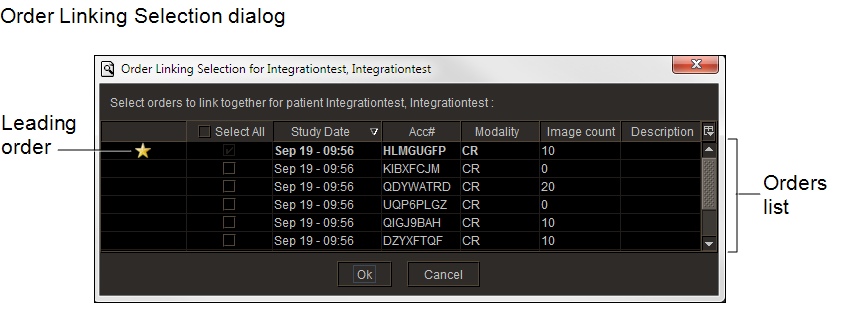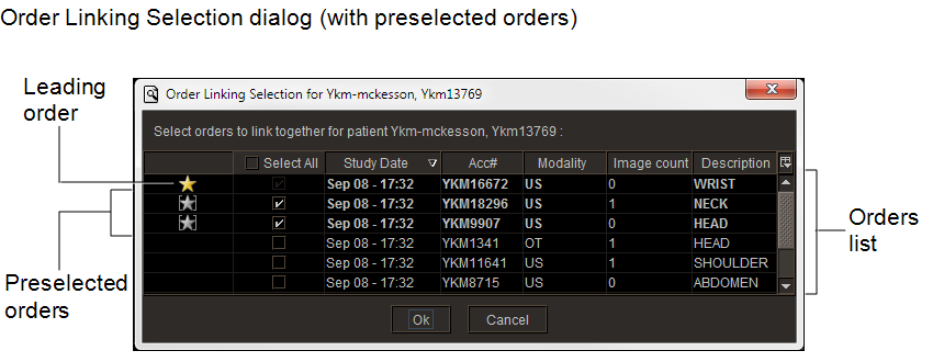 the list. This order is referred to as the leading order.Some orders that originate from a third-party PACS, such as a McKesson PACS, may appear with preselected orders in the Order Linking Selection dialog. This occurs when, for example, a single order includes images of multiple body regions for the same patient, but there are additional orders associated with aliased studies that refer back to the leading order that contains the images. In such cases, multiple star icons appear in the list. A yellow star icon