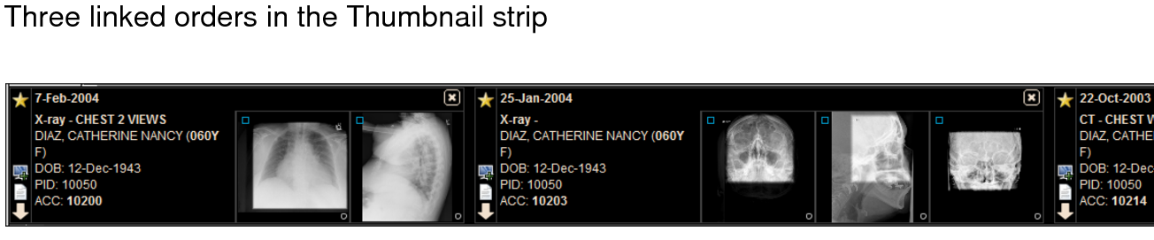 Another situation where you would want to link several orders from the same patient is because of billing practices. For example, you have a CT scan of the chest, abdomen, and pelvis where the images are under one study, but for billing you need to create three separate orders. You can link the three orders, and dictate them together to create a single report.
