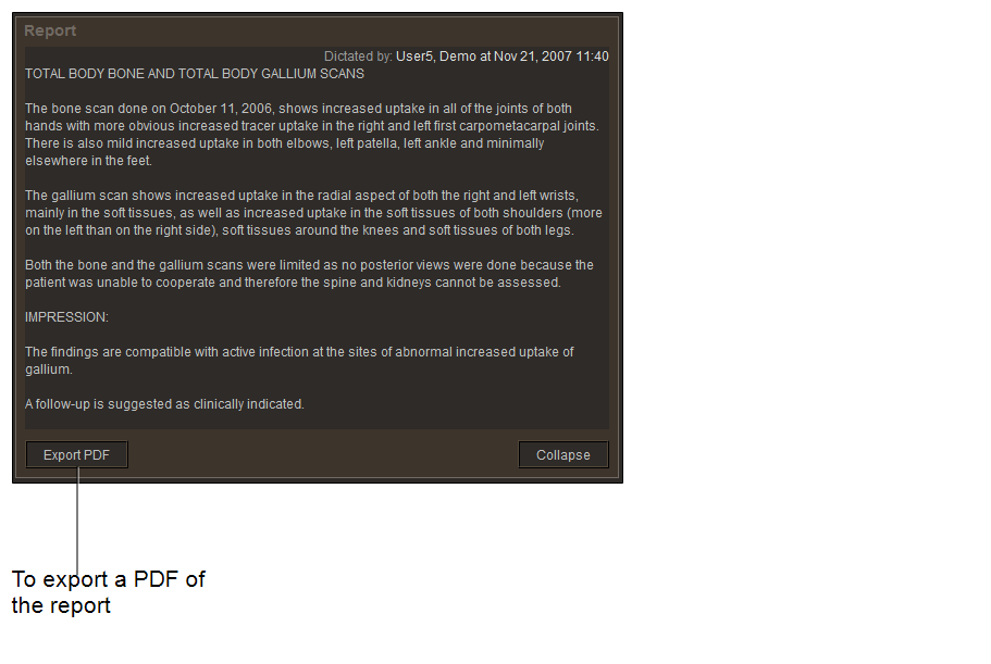 You can export transcribed reports as Adobe Portable Document Format (PDF) files, which can then be printed or sent via email or fax.
