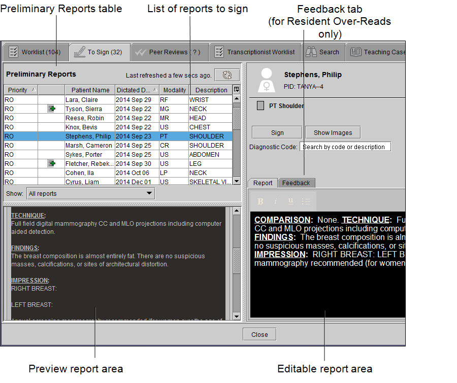 Reports are used to communicate details concerning a patient’s study to the patient’s referring physician. Signing a report is an important task for radiologists as the signed final report contains the findings, impressions, and a diagnosis associated with the study.