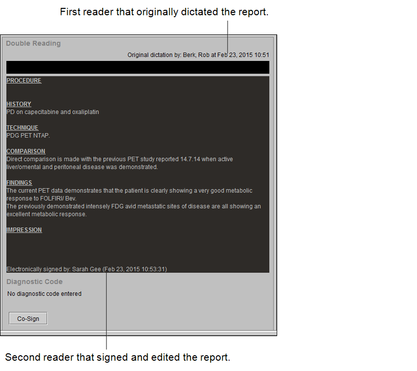 When you launch InteleViewer, the preliminary report is displayed in the Patient Record tab, but you cannot co-sign it. Close the report, open it from the Double Reads worklist, and then co-sign it.