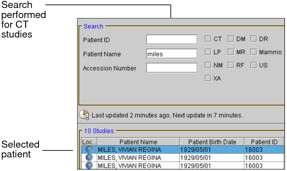 When you search for studies, your search results may not contain all of the studies for a particular patient, depending on the search filters that you used. For example, if you search for studies from only one modality, your results will not display studies that the patient may have obtained from other modalities.