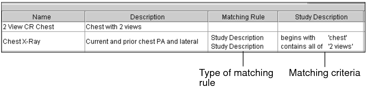 The Protocols list displays the study description matching criteria in the Procedure Code column, as well as the matching rule type in the Matching Rule column.