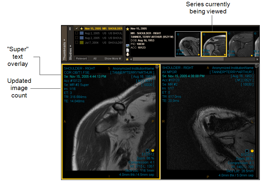 “Super” is added to the Modality, Series, and Dataset text overlay to identify the super series.