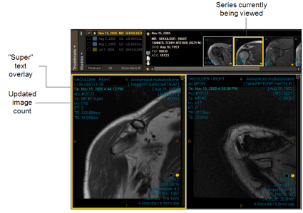 A yellow border appears around the thumbnail to indicate which series you are viewing in the currently selected viewport. The image count is updated as you stack through all images. Once you reach the last image in a series, you automatically jump to the first image of the next series, and so on, until you reach the last image in the last series.