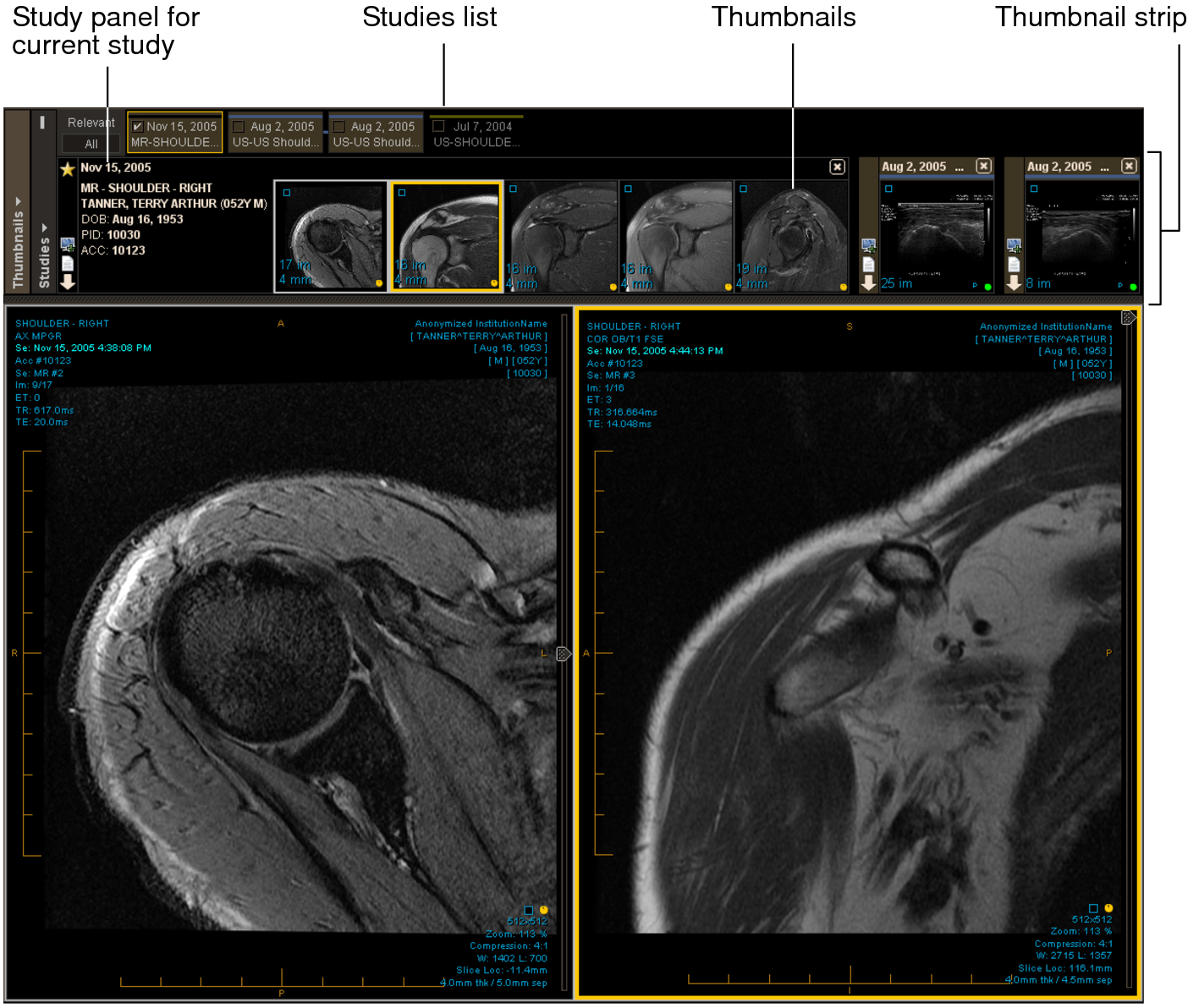 The Thumbnail view provides a quick method of selecting and viewing studies. When you open a study, the Thumbnail view shows the following main interface elements: