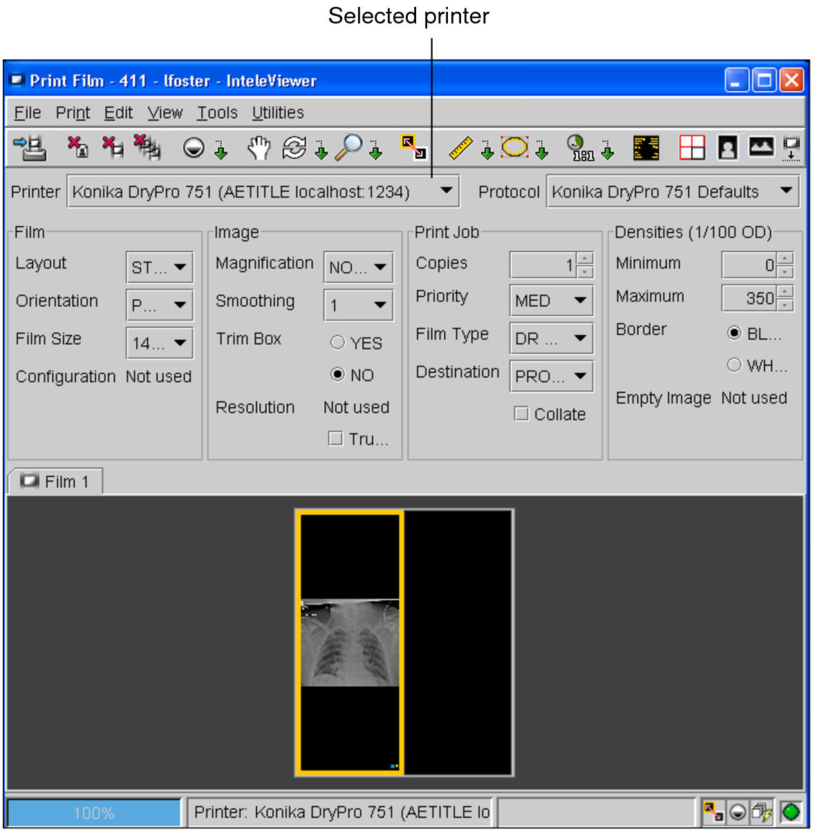 You can print selected images to film by using any one of several supported DICOM printers. Using the tools on the toolbar of the Print Film window, you can manipulate images as you would normally in InteleViewer before printing them. Any changes you make will appear on the printed image.
