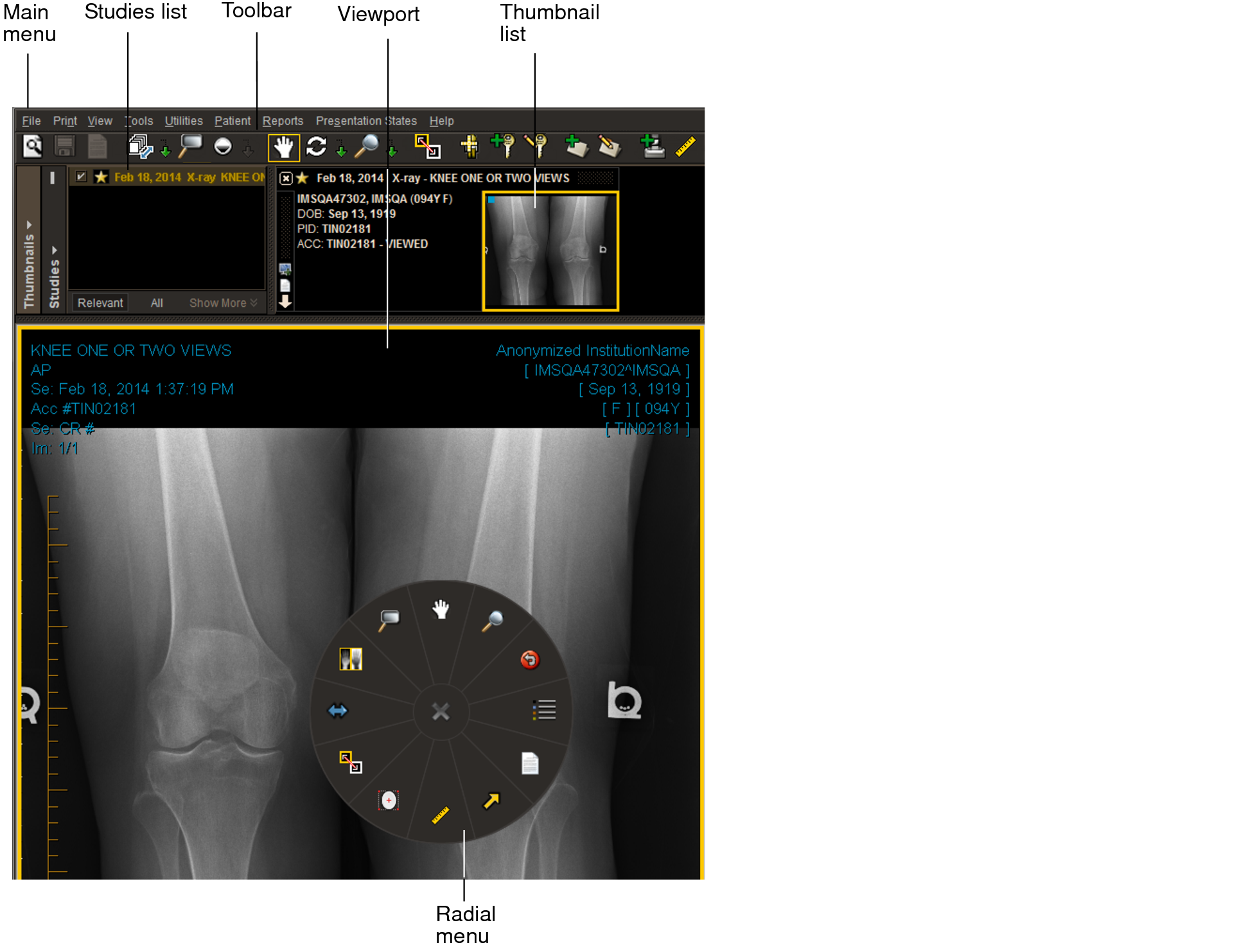 Main menu, toolbar, and radial menuUse these elements to select the InteleViewer functions.