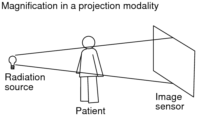 Projection radiographic images that are captured at the scanner are magnified because of the distances between the source of radiation, the patient, and the scanner’s image sensor. The greater these distances, the greater the magnification factor. The diagram below illustrates this magnification effect.