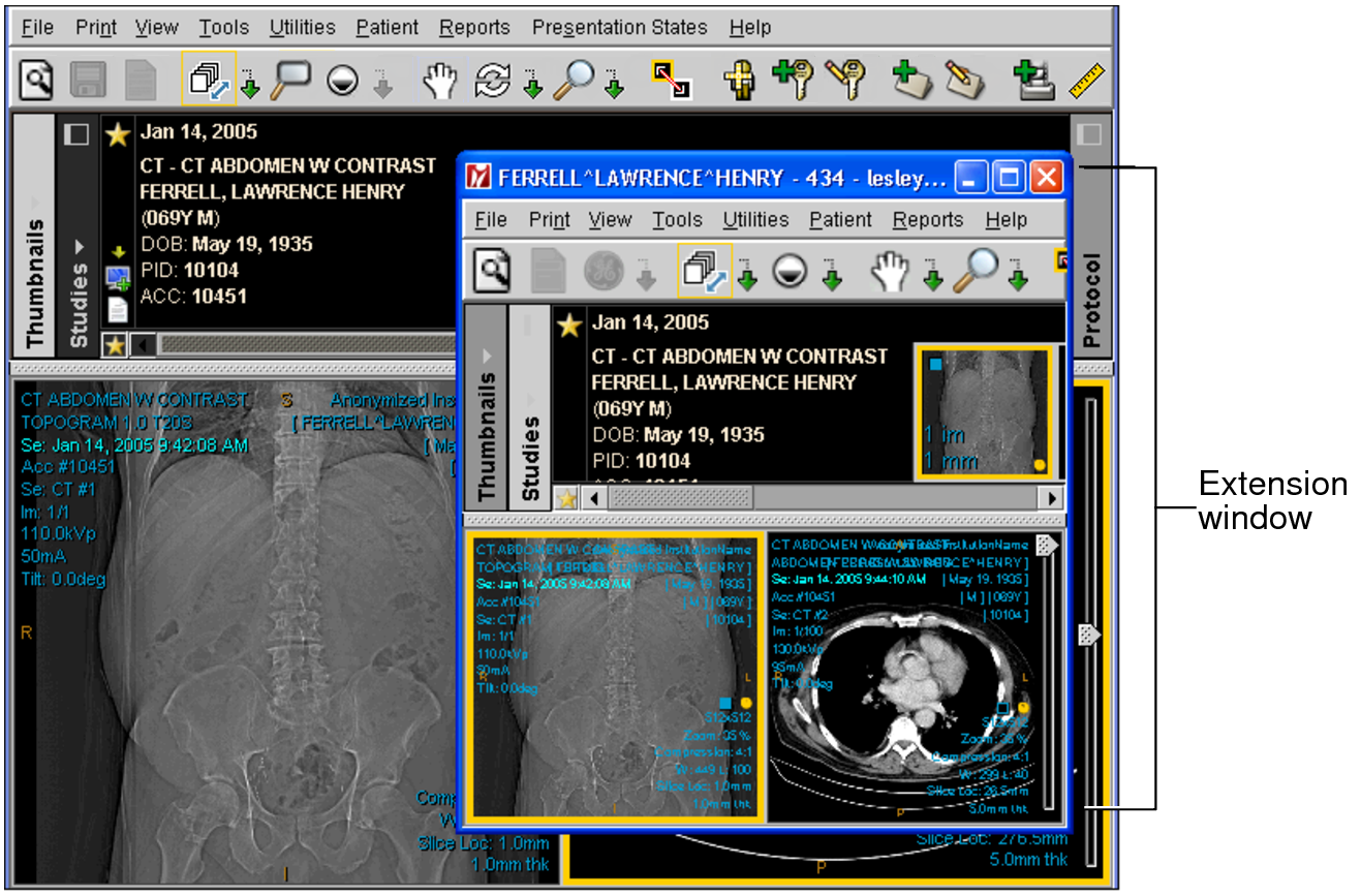 You can move the extension window anywhere in your monitor. InteleViewer retains the size and position of the extension window so the next time you open the extension window, it appears in the same location. Images in the extension window appear according to the grid layout preferences set for that modality in the User Preferences dialog. You can only open one extension window at a time.