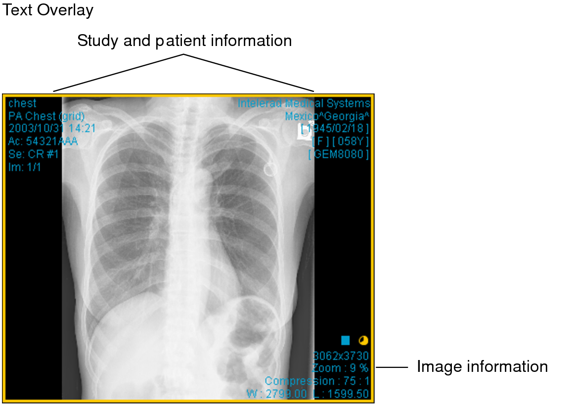 To display the related patient, study, and image information when you open images, select Show Text Overlay.
