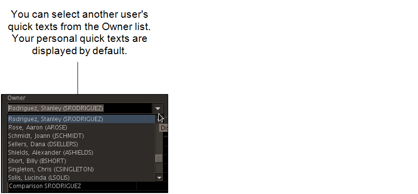 In the Quick Text Manager, search for the quick text that you want to duplicate. To search for another radiologist's or transcriptionist's quick text, select the name of the radiologist or transcriptionist from the Owner list.