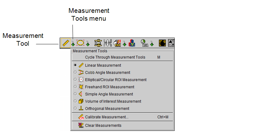 You can measure straight lines, elliptical regions of interest, simple angles, cobb angles, and volumes. Create multiple measurements of the same type or different types on a selected image, up to a maximum of ten measurement result lines per image.